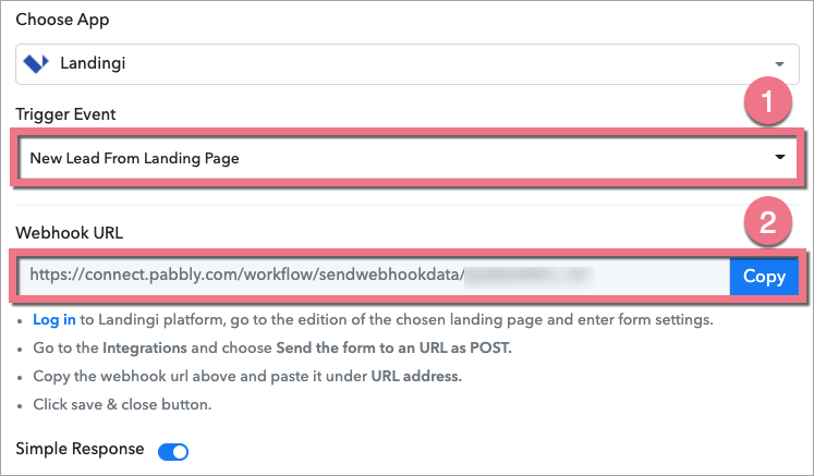 5. Choose New Lead From Landing Page as the Trigger Event (1). Then copy the Webhook URL (2).