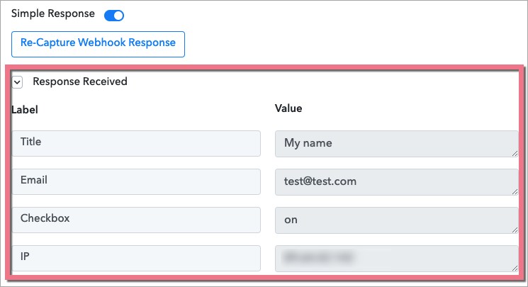 7. Go back to Pabbly Connect. The response should update automatically. If not, click Re-Capture Webhook Response. You will see the data you have entered in the form.