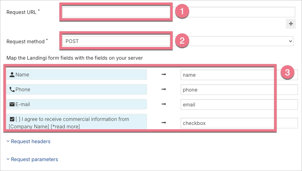 4. In the Request URL field, paste the URL (1) copied from Pabbly Connect. Choose POST as the request method (2). Then connect form fields (3) with fields in your integration.