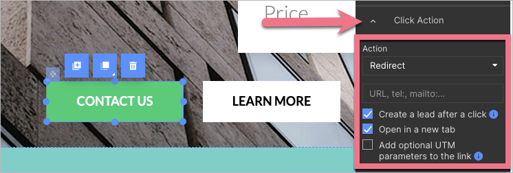 - select the Create a lead after a click option (Open in a new tab is optional).