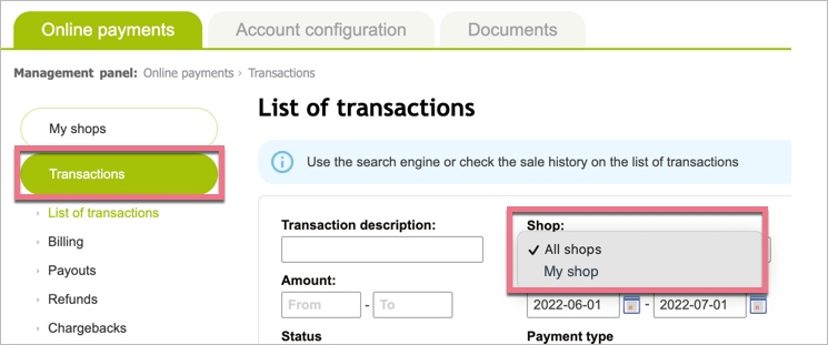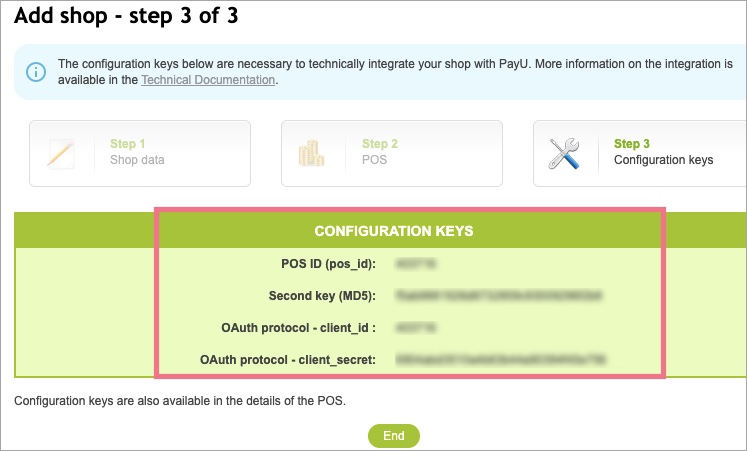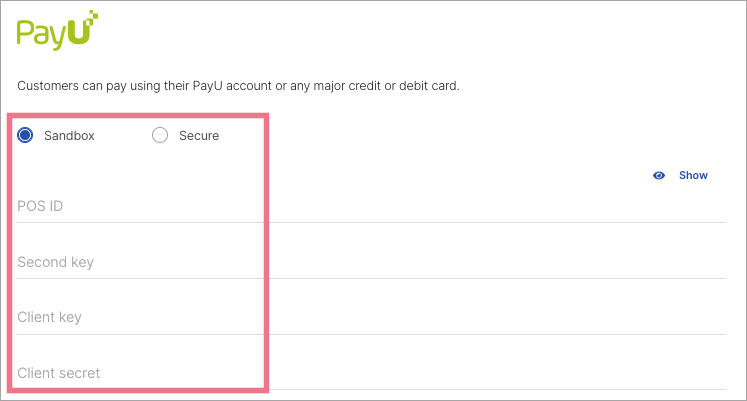 3. Scroll down and navigate to the PayU box. Paste the API keys and select Sandbox for test transactions, or Secure if you want to launch an actual sale. Remember that the settings selected in this section must match the settings in your PayU account panel.