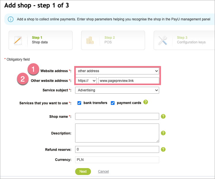 3. To connect the payment gateway to your landing page, select other address (1) and enter the URL (2). Fill in the required data. Once you’re ready, you can proceed to the next step.