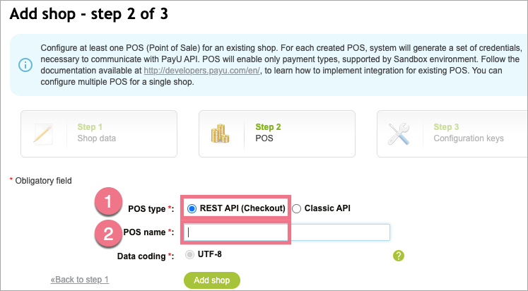 4. Select REST API (Checkout) (1) and type in POS (Point of Sale) name (2). Click on Add shop.