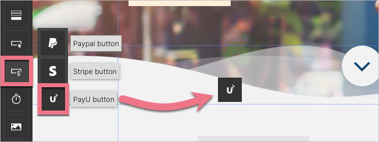 3. Now, you can add a PayU button to your landing page. On the left side of the editor, hover over the Pay buttons, then choose the PayU button and drag and drop it into the active area of your landing page. Go to its Settings.