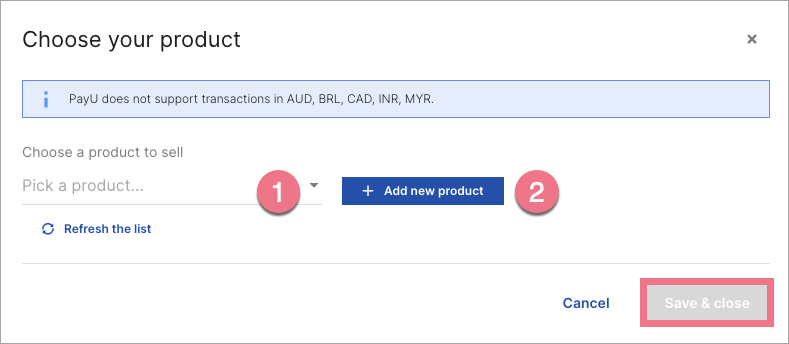 4. Select a product from the list (1) or add a new one (2) and refresh the list to link it to this payment gateway. Then Save & close. You can add only one product to a single PayU button, but you can add multiple buttons to your landing page.