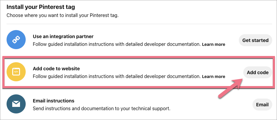 3. Scroll down to the Install your Pinterest tag section. Choose Add code to website and click Add code.