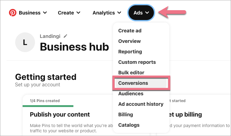 1. Log in to your Pinterest account, and in the top menu, click the Ads tab and then Conversions.