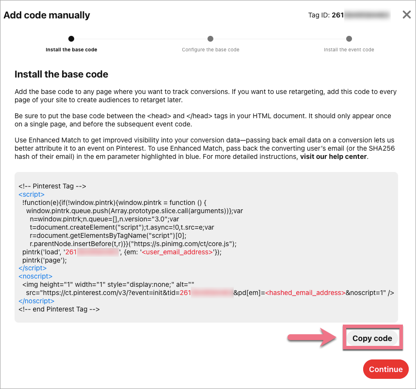 4. You will see a tag (base code) configuration window. Scroll down and click Copy code.