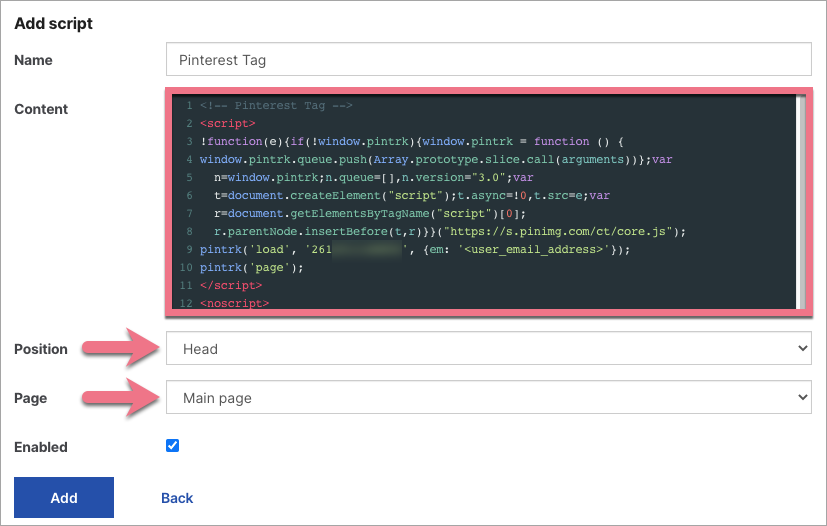 3. Name the script and paste the tag in the Content field. Choose the Head position on the Man Page. Then click Add.
