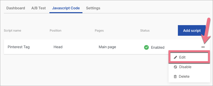 1. Log in to your Landingi account and go to the JavaScript Code tab of a landing page to which you want to add the Pinterest tag.