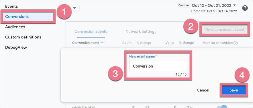 Navigate to the Configure section, then go to the Conversions (1) tab > click New conversion event (2) > enter the event name Conversion (3) > click Save (4).