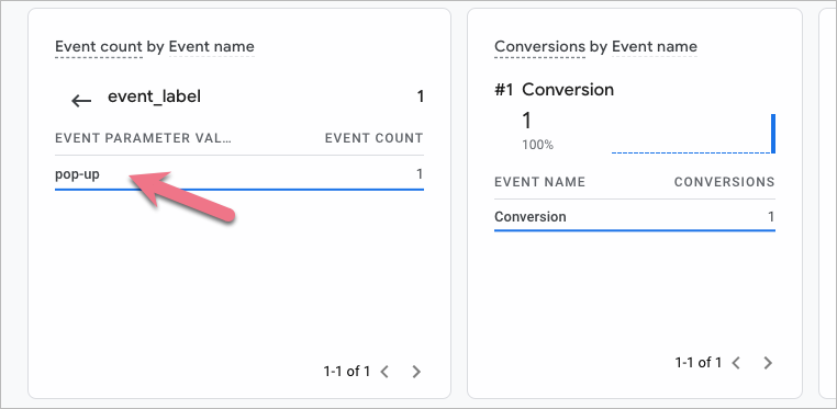 4. To see the pop-up name, click on the event name Conversion, then click event_label.