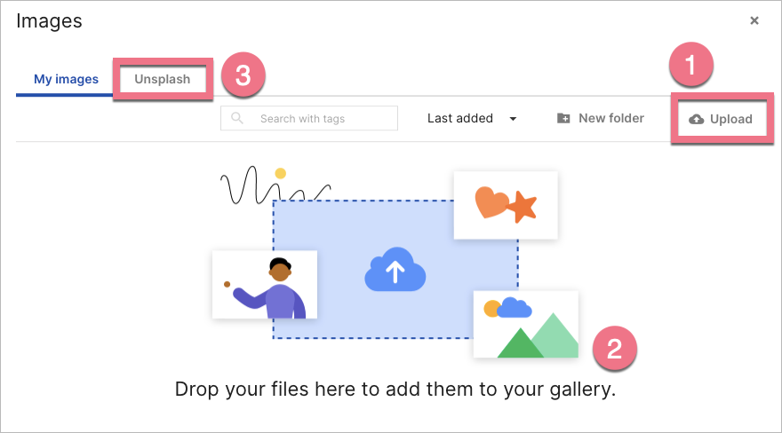 2. Upload your image: click Upload (1); drag files from your computer and drop them in the editor (2); or add images from Unsplash (3).
