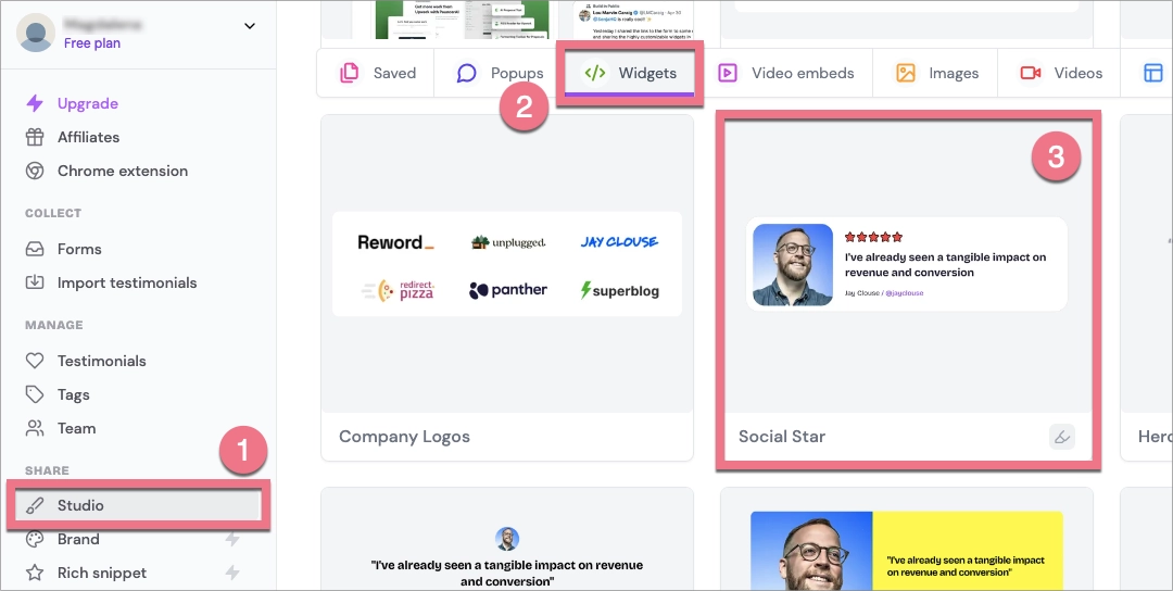 2. Go to the Studio (1) tab, and under Widgets (2), select the testimonial widget style you want to create (3) (you can change it later).
