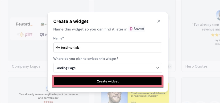 3. Name your widget, choose where do you plan to embed it, and click Create widget.