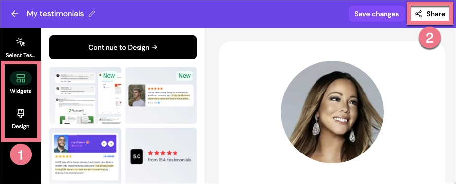 4. Adjust the widget’s rules, settings, and design (1). When you’re ready, click Share (2).