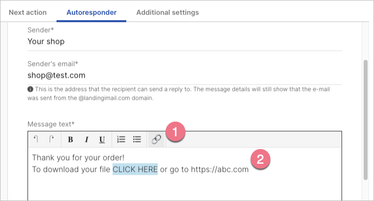 3. Go to the Autoresponder tab and fill in the fields. Create a link from the text (1) or include the download link in the content of the message (2). Then Save and close.