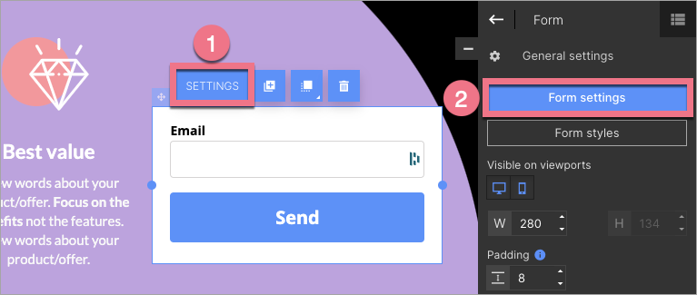 2. Click on the form and enter its Settings from the context menu (1) or the toolbar (2).
