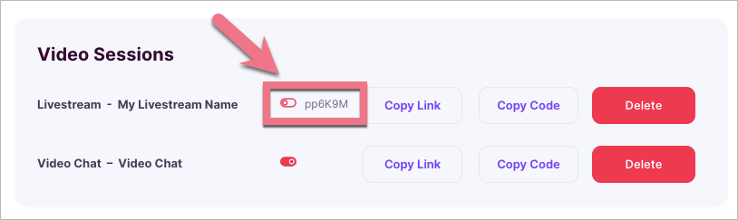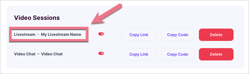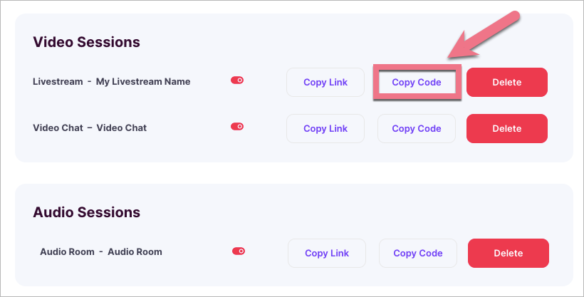 4. Your stream session will be added to an applicable section. Click Copy Code next to the stream you want to embed on your landing page.