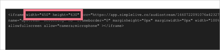If you want to change the size of the SimpleLive stream widget, edit width and height values in the code: