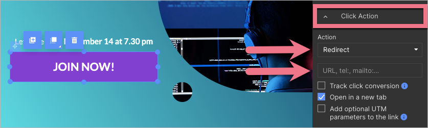 Go to the landing page editor and select the button. In the right-side toolbar, unfold the Click Action tab. Select Redirect as the Action and paste the link in the URL field. Check the Open in a new tab option. Then publish your landing page.