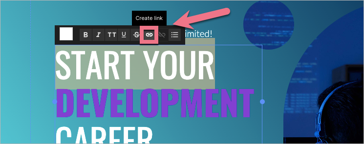 Go to the landing page editor and select the text. Click the Create link icon in a context menu.
