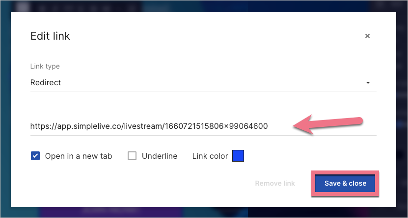 In a new window, select Redirect as a Link type and paste your link in the URL field. Check the Open in a new tab option and click Save & close. Then publish your landing page.