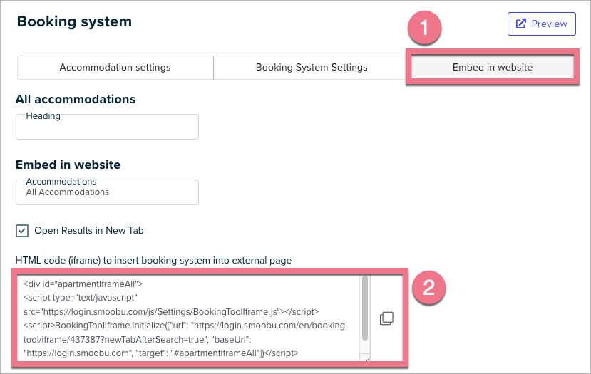 3. Navigate to the Embed in website (1) tab. Fill out the fields and copy the HTML code (2).