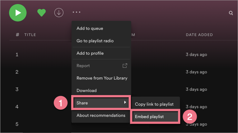 3. Choose Share (1) from the drop-down menu and click Embed playlist (2).