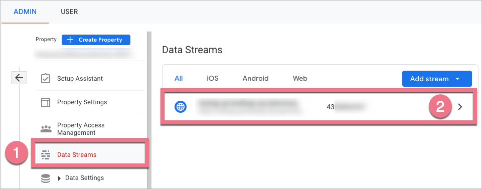 1. Go to your GA4 panel and navigate to the property dedicated to your landing page. Click Data Streams (1) and choose your stream (2).