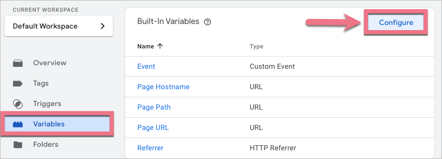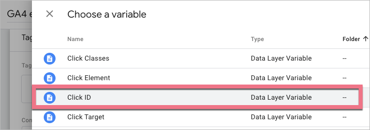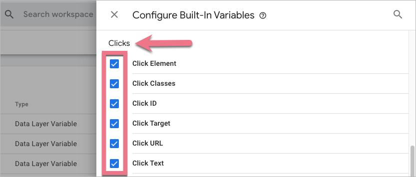 2. Find Clicks. Enable variables – in this case, the most important is the Click ID variable.
