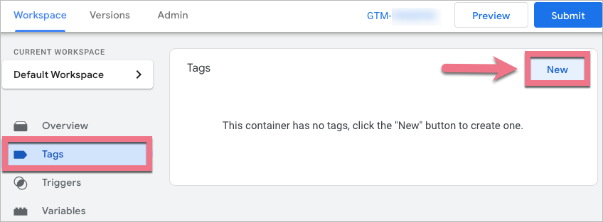 3. In a new browser tab, open your GTM. Go to Tags and click New.