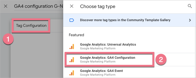 4. Click Tag Configuration (1) and select Google Analytics: GA4 Configuration (2).