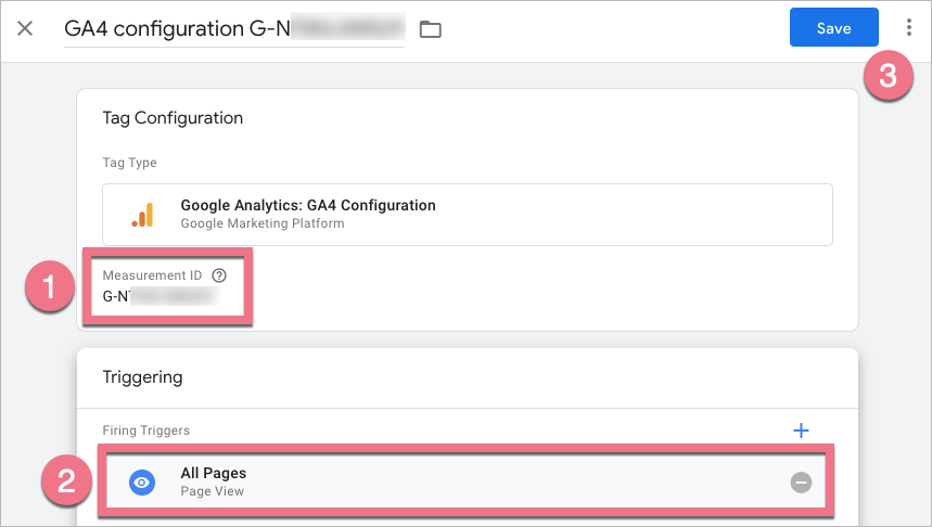 5. Paste the copied ID in the Measurement ID (1) field. Then choose All Pages (2) as the trigger. Name the trigger and click Save (3).