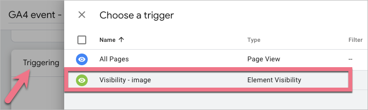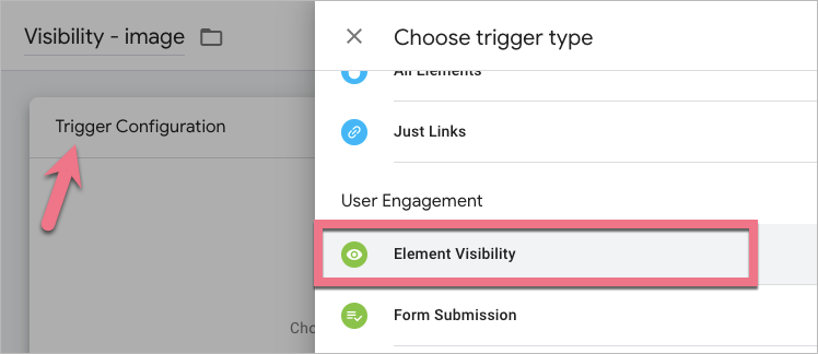 4. Name it and click Trigger Configuration. Choose Element Visibility as a trigger type.
