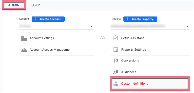 1. In GA4, go to Admin and click Custom definitions under your property.
