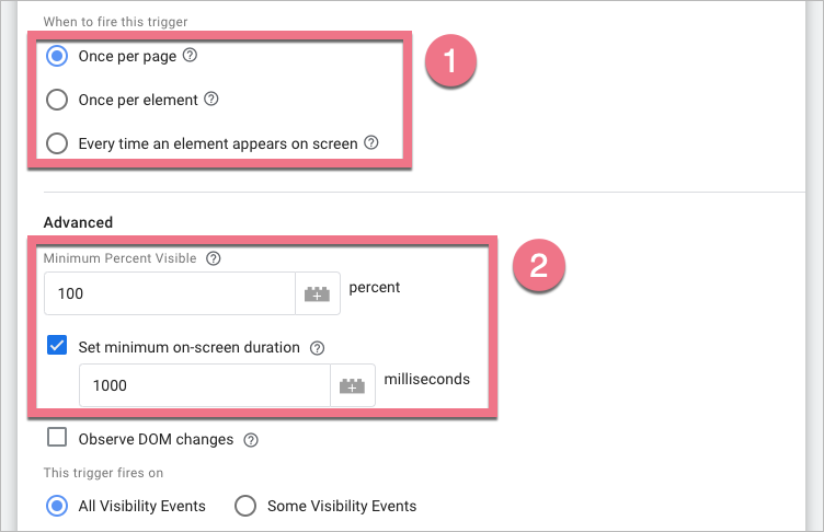 6. Decide when to fire the trigger (1). You can also define the Minimum Percent Visible and set a minimum on-screen duration for the tracked element (2).