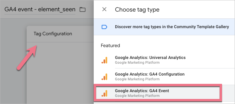 8. Name the tag and go to its configuration. Select Google Analytics: GA4 Event as a tag type.