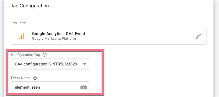 9. As a Configuration Tag, choose the tag created in the first step. Name your event – you can use a custom event name, e.g. element_seen (this is the name you will see in your GA4 reports).