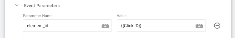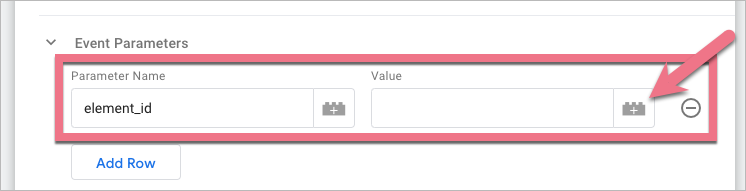 10a. If you want to track additional information, like element ID, you can add some Event Parameters. To create a new event parameter, click Add row. Name the parameter (you can type any custom name). Then click the plus icon next to the Value field.