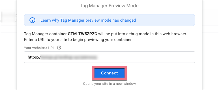6. When the tag is saved, click Preview. In a Tag Assistant pop-up window, paste your website’s URL and click Connect. Then click Continue.