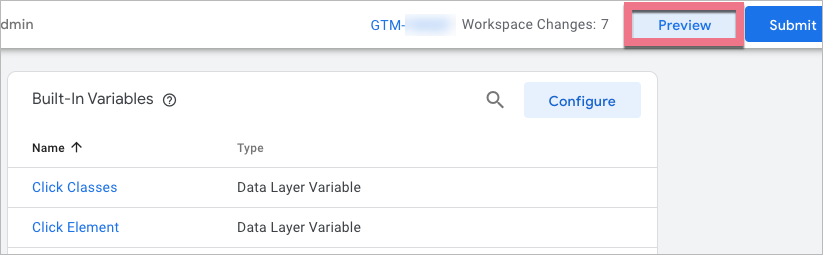 1. In your GTM panel, go to Variables and click Configure.