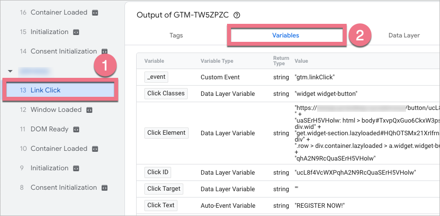 5. You should see a Link Click (1) event in your Tag Assistant. Click it and go to Variables (2). There is all information from the event. In a few seconds, we will use the Click ID variable in a trigger.
