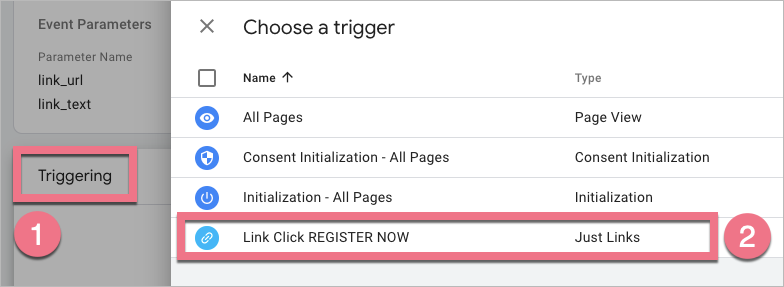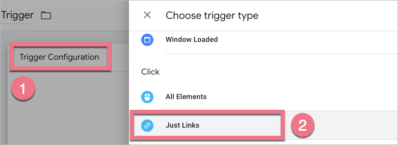 7. Click Trigger Configuration (1) and select Just Links (2).