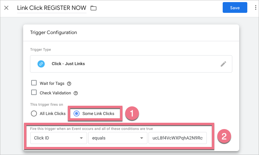 Then enter condition (2). In our case, the easiest way is to use the Click ID variable: select Click ID > equals > paste the ID number from variables seen in Tag Assistant (see pt 5).