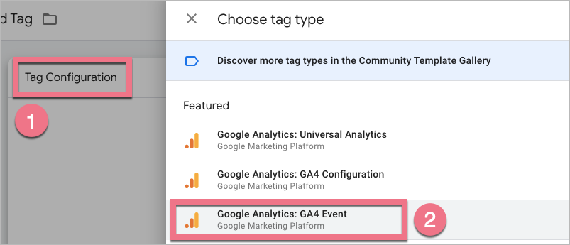 10. Click Tag Configuration (1) and select Google Analytics: GA4 Event (2).