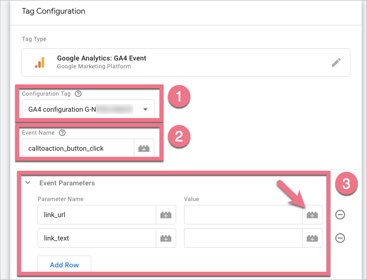 If you want to track some additional information (e.g. the URL of the button, the text of the button), you can add some Event Parameters (3).