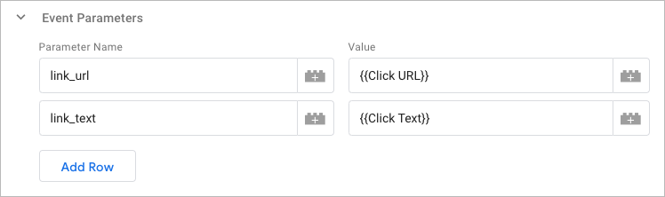 To create a new event parameter, click Add row. Name the parameter; you can reuse parameters of the events already existing in GA4 (see Google guide on Events measurement and parameters). For example, we chose link_url and link_text.