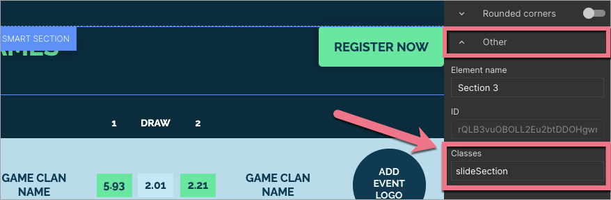 1. Go to the editor of your landing page and create a section that, by default, should expand. Then, click on it, and in a right-side toolbar, scroll down until you find the Other tab. Type slideSection in the Classes field.