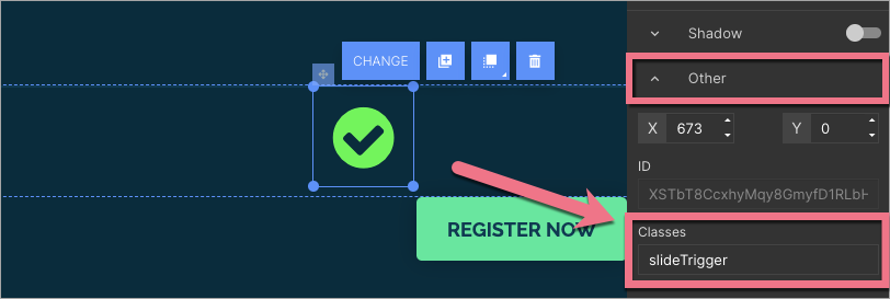 2. Above the section, create another one with an element (e.g., icon, button, or text) that should be responsible for unfolding. Click on the element, find the Other tab, and type slideTrigger in the Classes field.